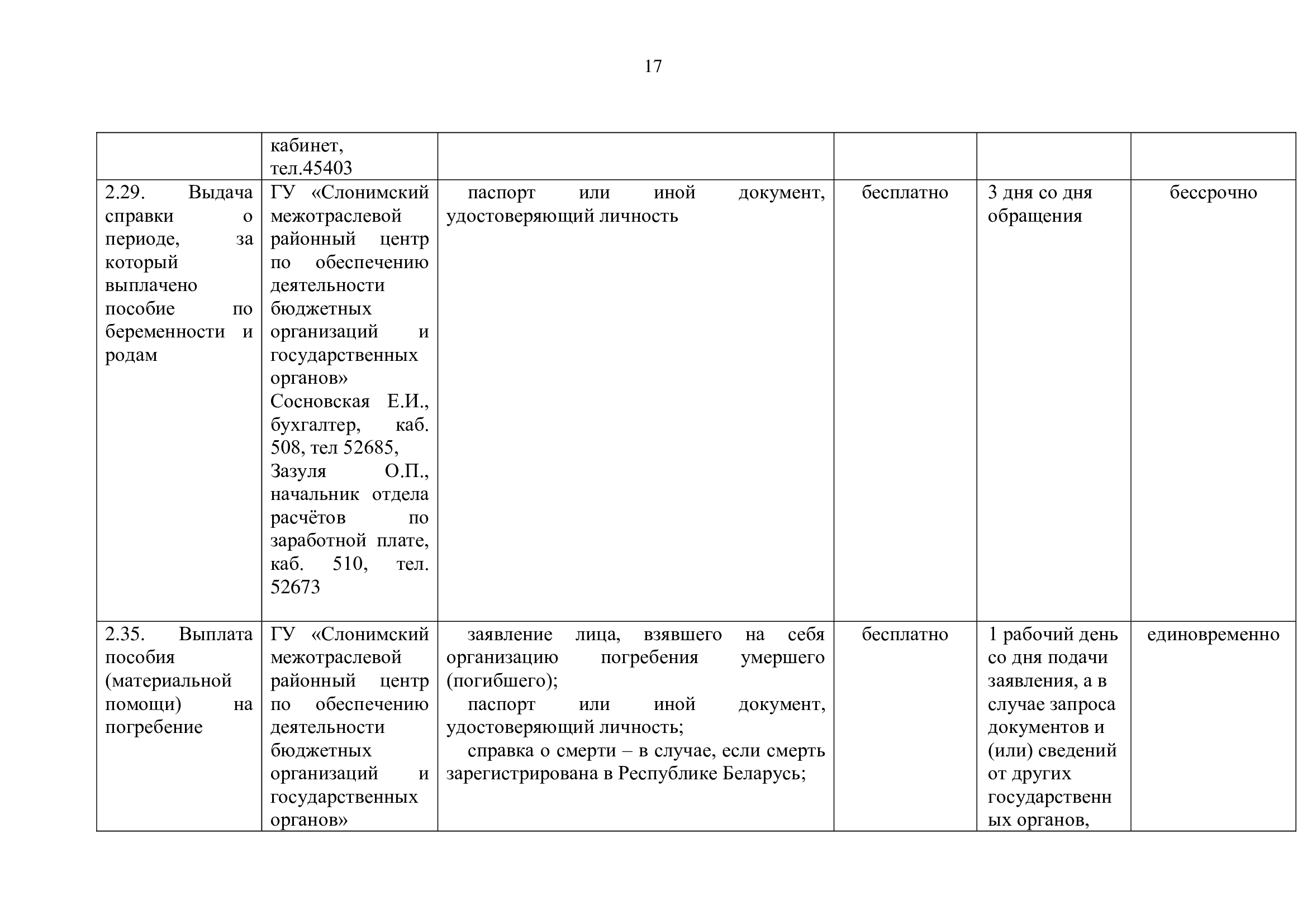 о выплате пособия (материальной помощи) на погребение необходимо обратиться в государственное учреждение «Слонимский межотраслевой районный центр по обеспечению деятельности бюджетных организаций и государственных органов» по адресу: Республика Беларусь, Гродненская обл., г. Слоним, ул. Красноармейская, д. 40, тел. 8 (01562) 52685 кабинет 508 к Сосновской Елене Ивановне с 8.00 - 13.00; 14.00 - 17.00, в её отсутствии к Зазуле Ольге Петровне, 510 каб. тел. 8 (01562) 52673.